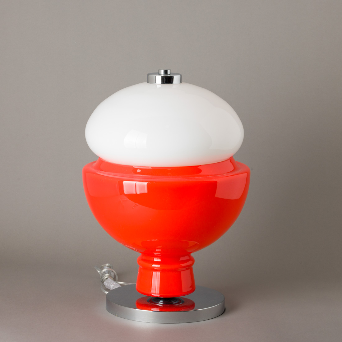 Em vidro opalino branco e laranja, base em metal cromado. Sinais de uso.