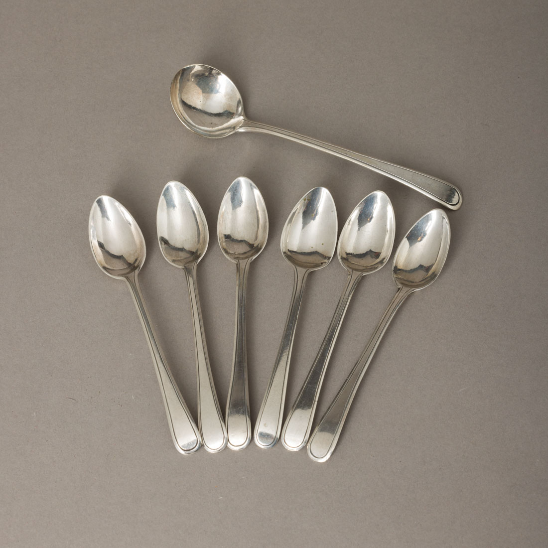 595. CONJUNTO DE SEIS COLHERES DE CHÁ E CONCHA DE AÇÚCAR