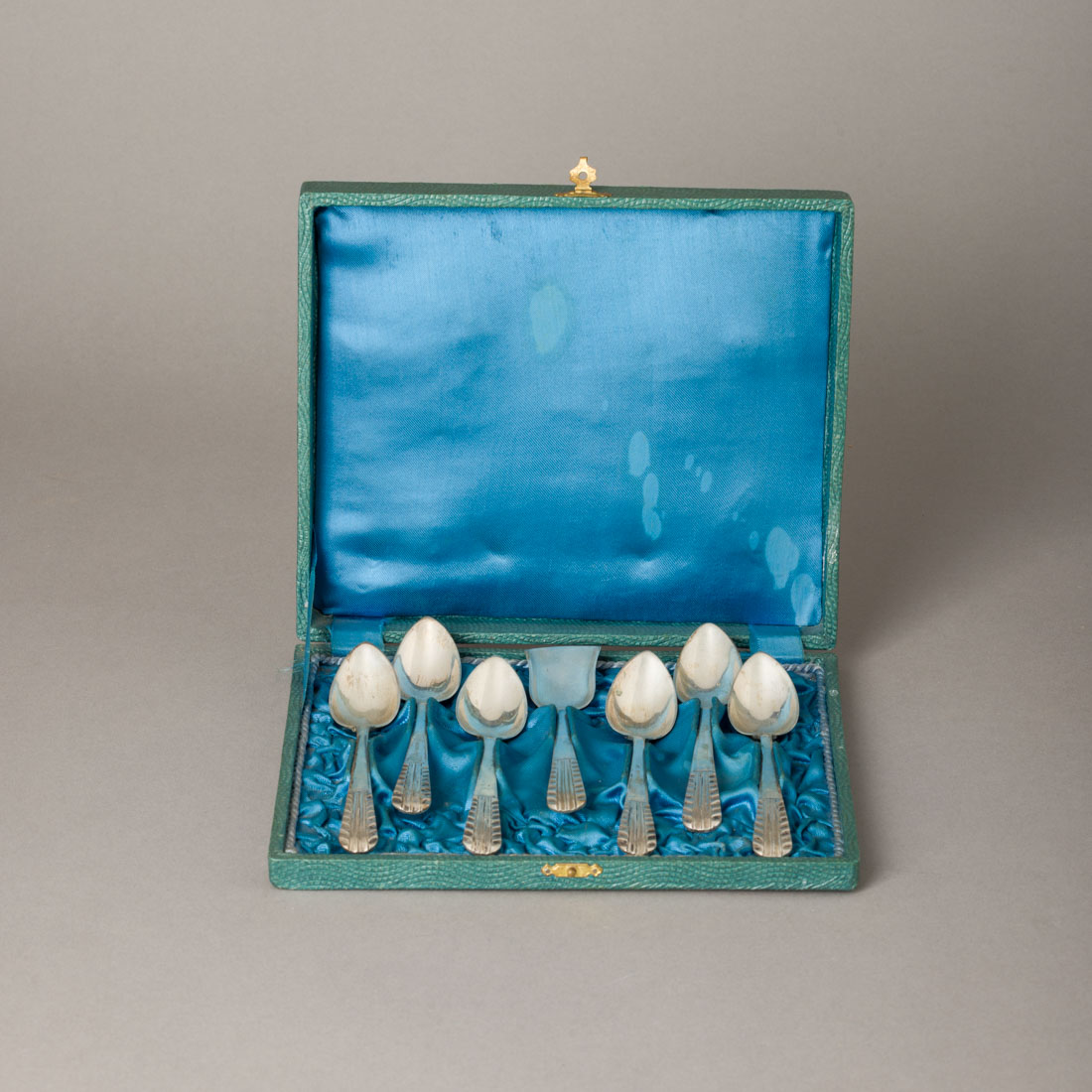 602. CONJUNTO DE SEIS COLHERES DE CHÁ E CONCHA DE AÇÚCAR