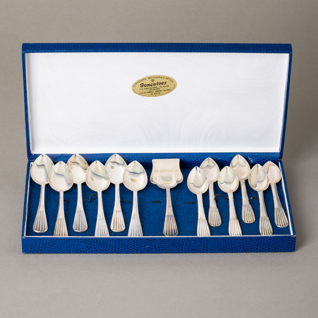 604. CONJUNTO DE SEIS COLHERES DE CHÁ, SEIS DE CAFÉ E CONCHA DE AÇÚCAR