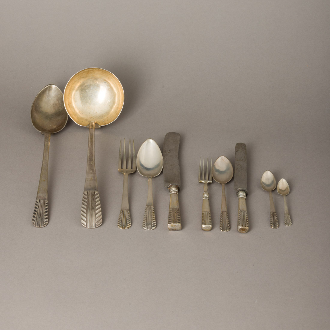 Em prata portuguesa contraste javali (1887-1937) de 833, decoração relevada. Composto por talheres de carne, de sobremesa, colheres de sopa, de sobremesa, de chá e de café, concha de sopa e colher de arroz. Sinais de uso. Peso total aprox: 4689 g.