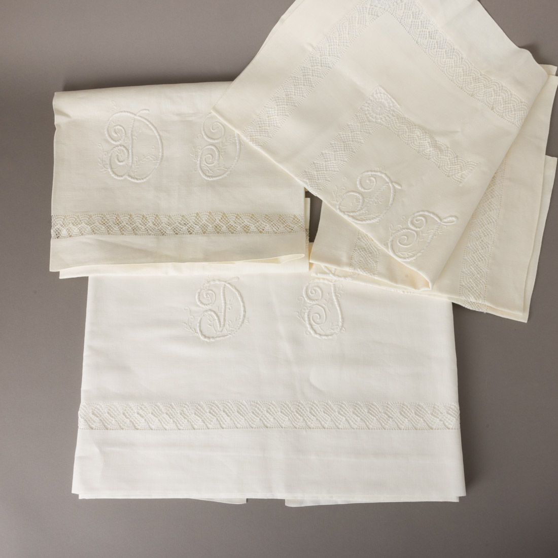 Em linho bordado a mão e ajour, monogramadas. Sinais de uso.