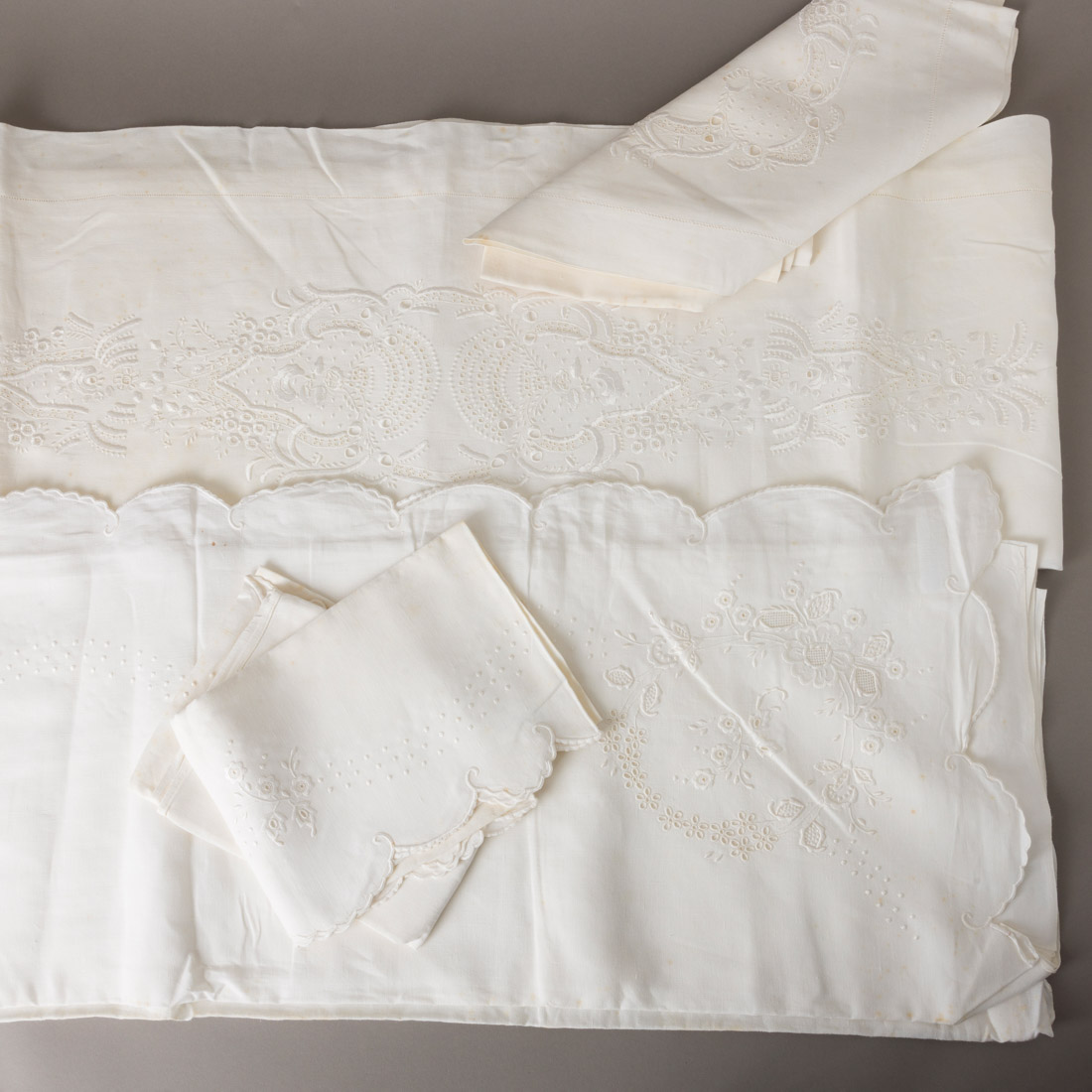 Em linho bordado a mão. Sinais de uso e manchas de estarem guardados.