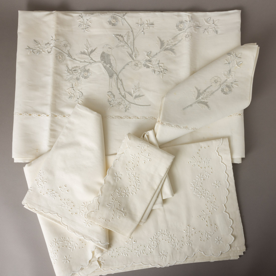 Em linho bordado a mão. Sinais de uso e pequenas manchas de estarem guardados.