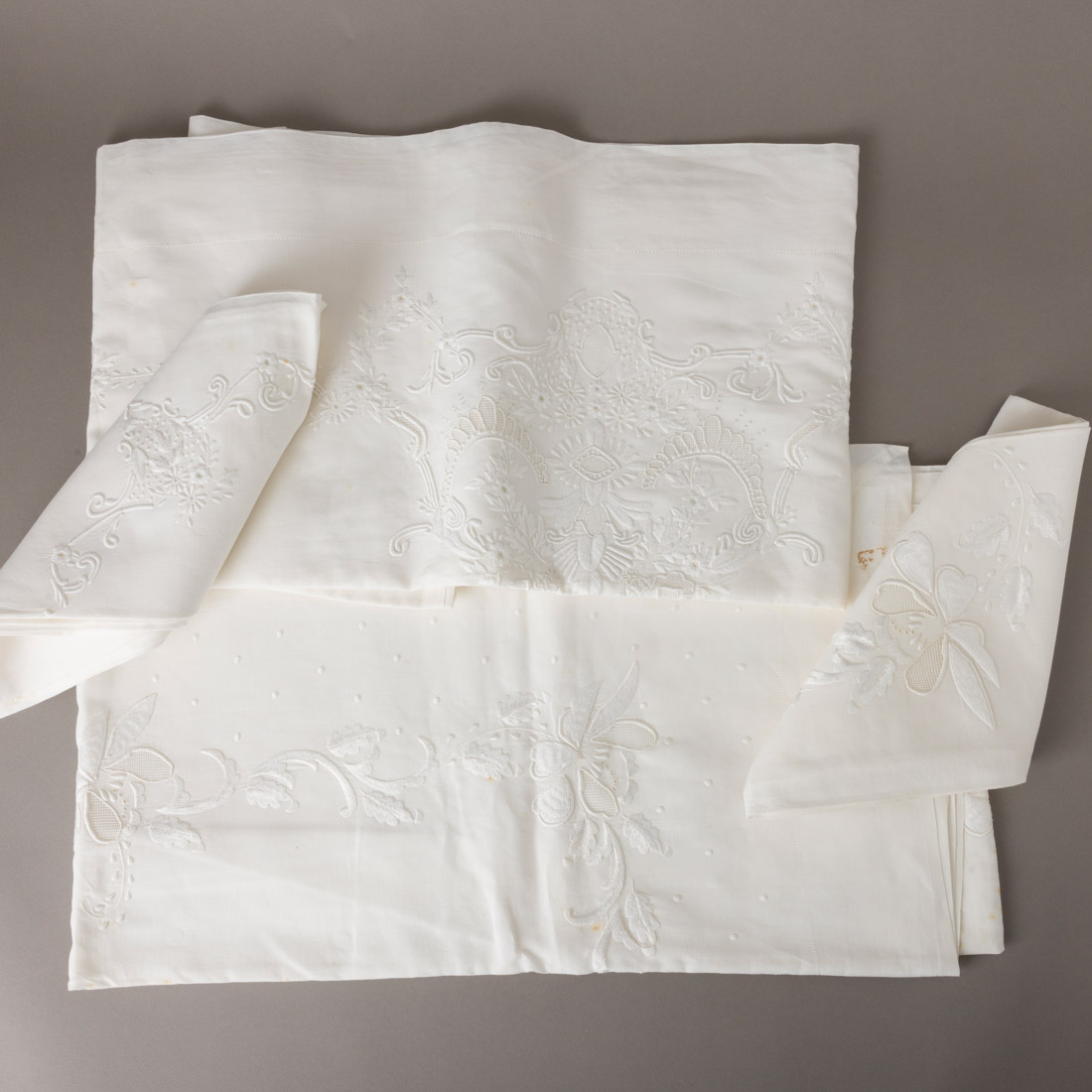 Em linho bordado a mão Sinais de uso e manchas de estarem guardados.
