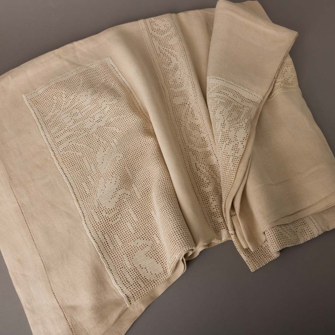 Em linho bege com aplicações em croché de algodão. Manchas e defeitos.