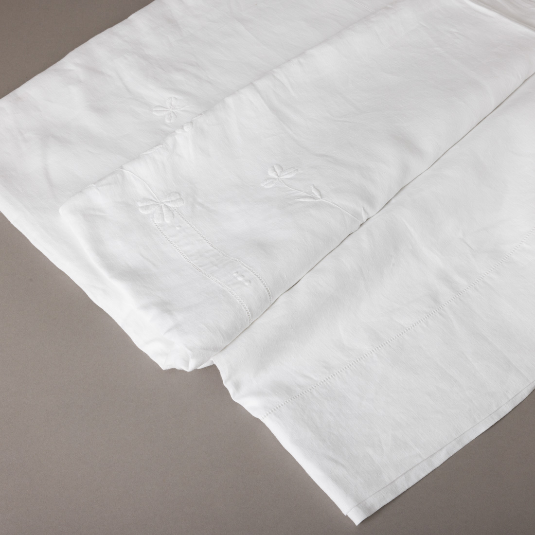 Em linho bordado a mão com trevos. Sinais de uso, ínfimas manchas e pequenos defeitos.
