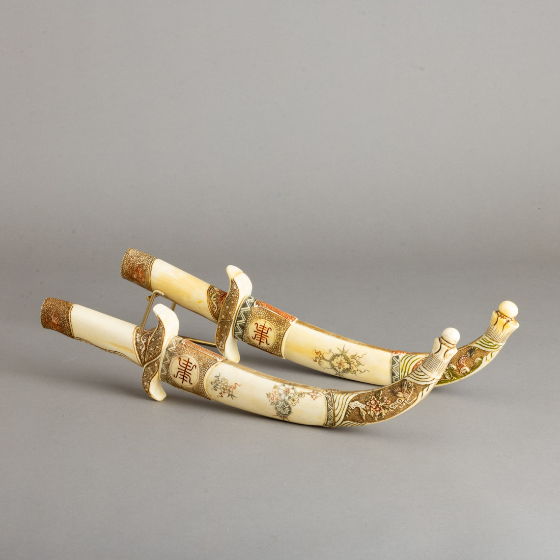 Bainha, punho e lamina em marfim e osso esculpido e gravado, decoração policromada com dragões e pássaros. China, Séc. XX. Sinais de uso, pequenos defeitos.