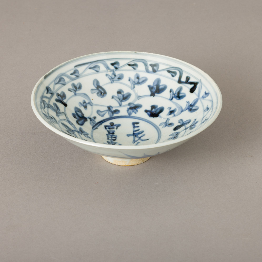 Em porcelana da China, decoração a azul com folhagem. Sinais de uso.