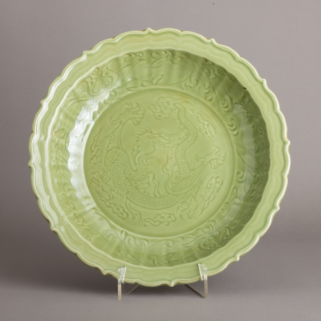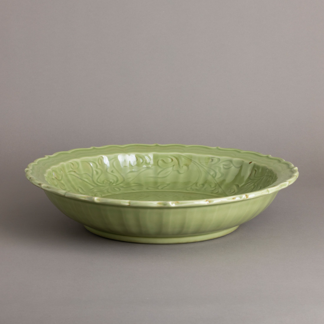 Em cerâmica chinesa, decoração monocroma verde celadon, gomada e gravada "dragão e folhagem". Sinais de uso.
