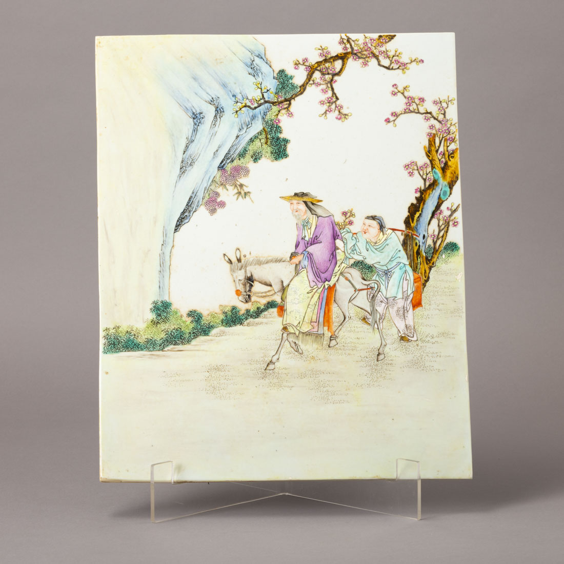 Em porcelana da China, decoração policromada paisagem com cavalo e duas figuras. Sinais de uso.