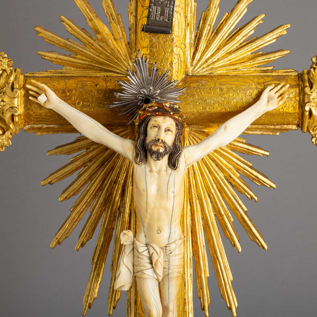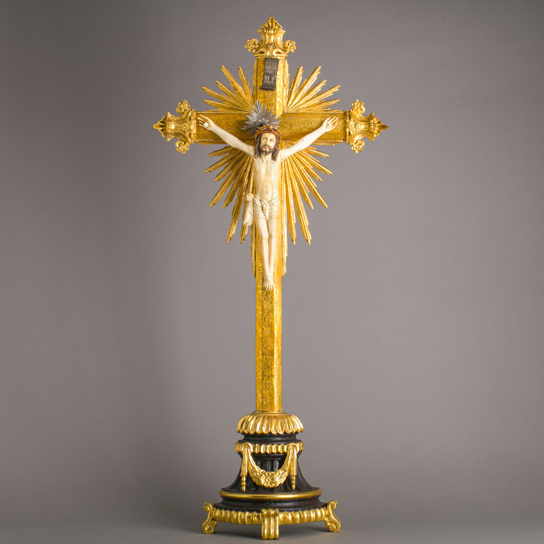 Escultura em marfim parcialmente policromado e dourado, cruz em madeira com resplendores e terminais em talha dourada, peanha em madeira marmoreada e dourada. Sinais de uso.
