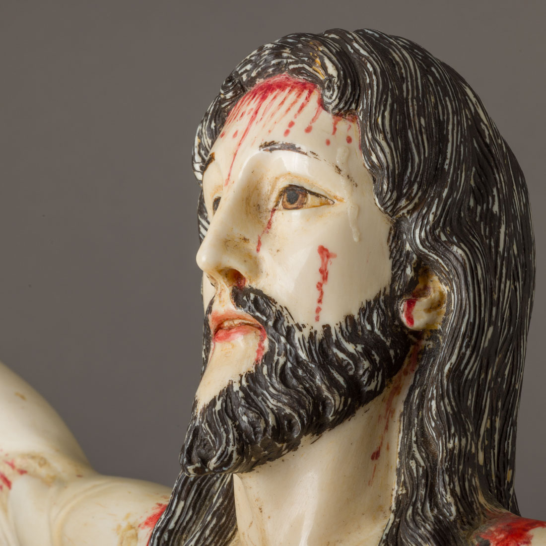 Escultura em marfim parcialmente policromado Europa, Séc. XX. Pequenos defeitos e fissuras.