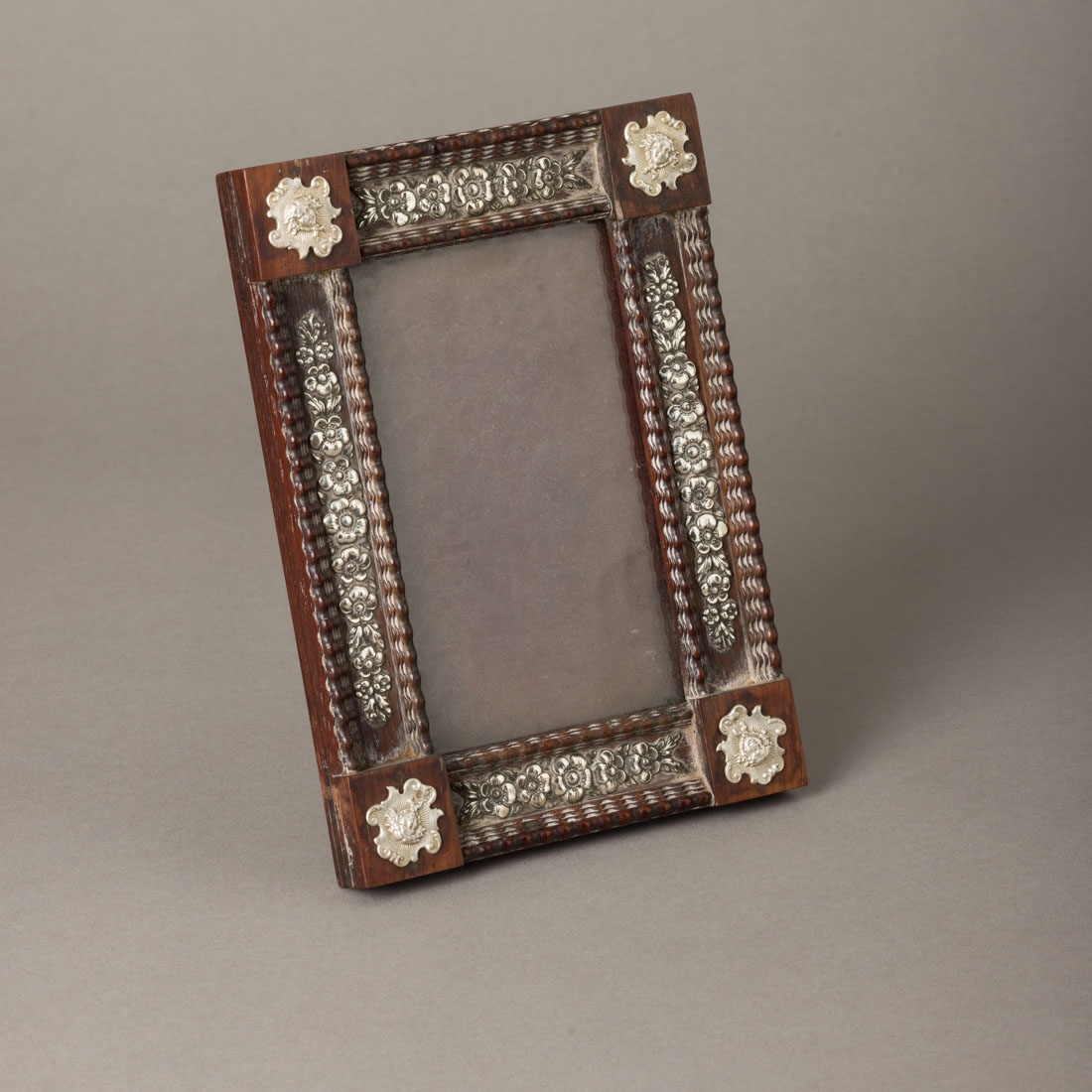 Em pau santo com tremidos e aplicações em prata portuguesa contraste javali (1887-1937) de 833, decoração relevada. Sinais de uso e pequenas falhas na prata.