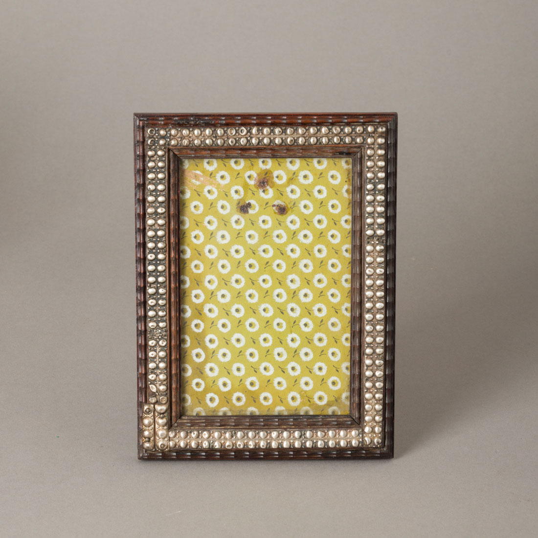 Moldura em pau santo com tremidos, aplicações em prata decorada com frisos de perlados. Sem marcas, ao abrigo do Decreto-Lei n.º 120/2017. Pequenas falhas e amolgadelas.