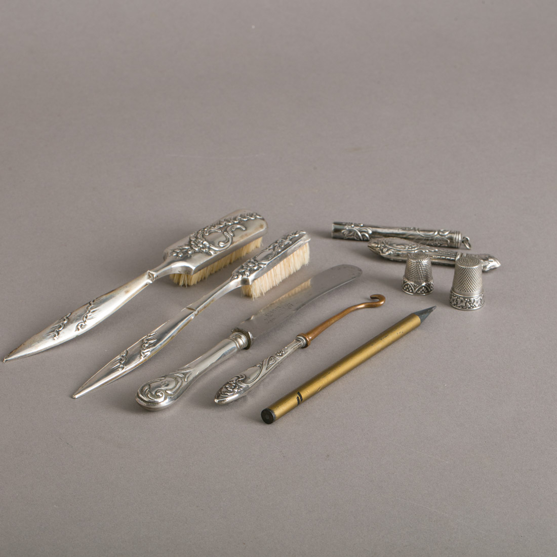 783. ESCOVAS DE DENTES (2), DEDAIS (2), AGULHEIRO, FACA E UTENSÍLIOS (2)