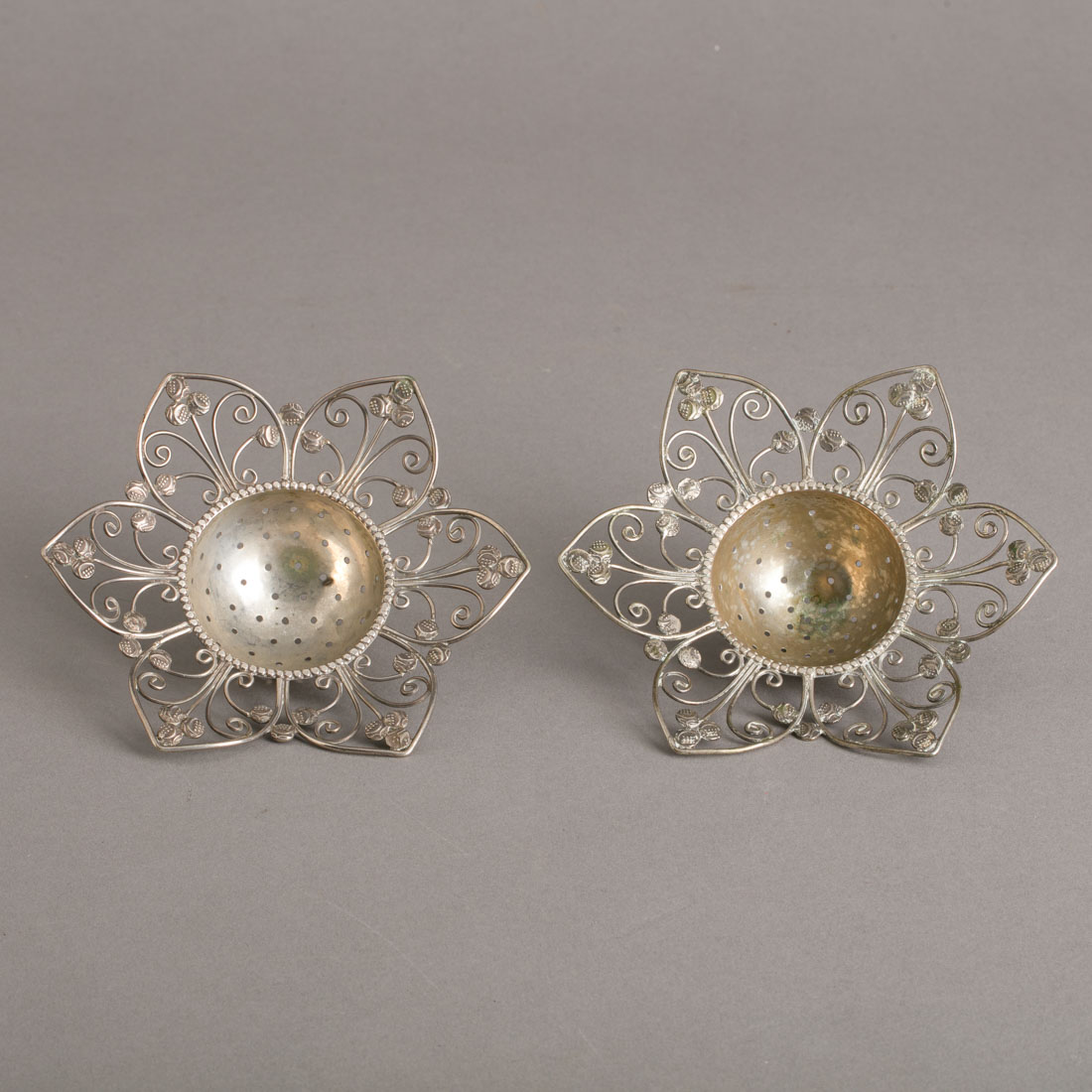 Um em prata, outro em metal prateado, decoração vazada "frutos". Sem marcas, ao abrigo do Decreto-Lei n.º 120/2017. Sinais de uso, um com amolgadelas.