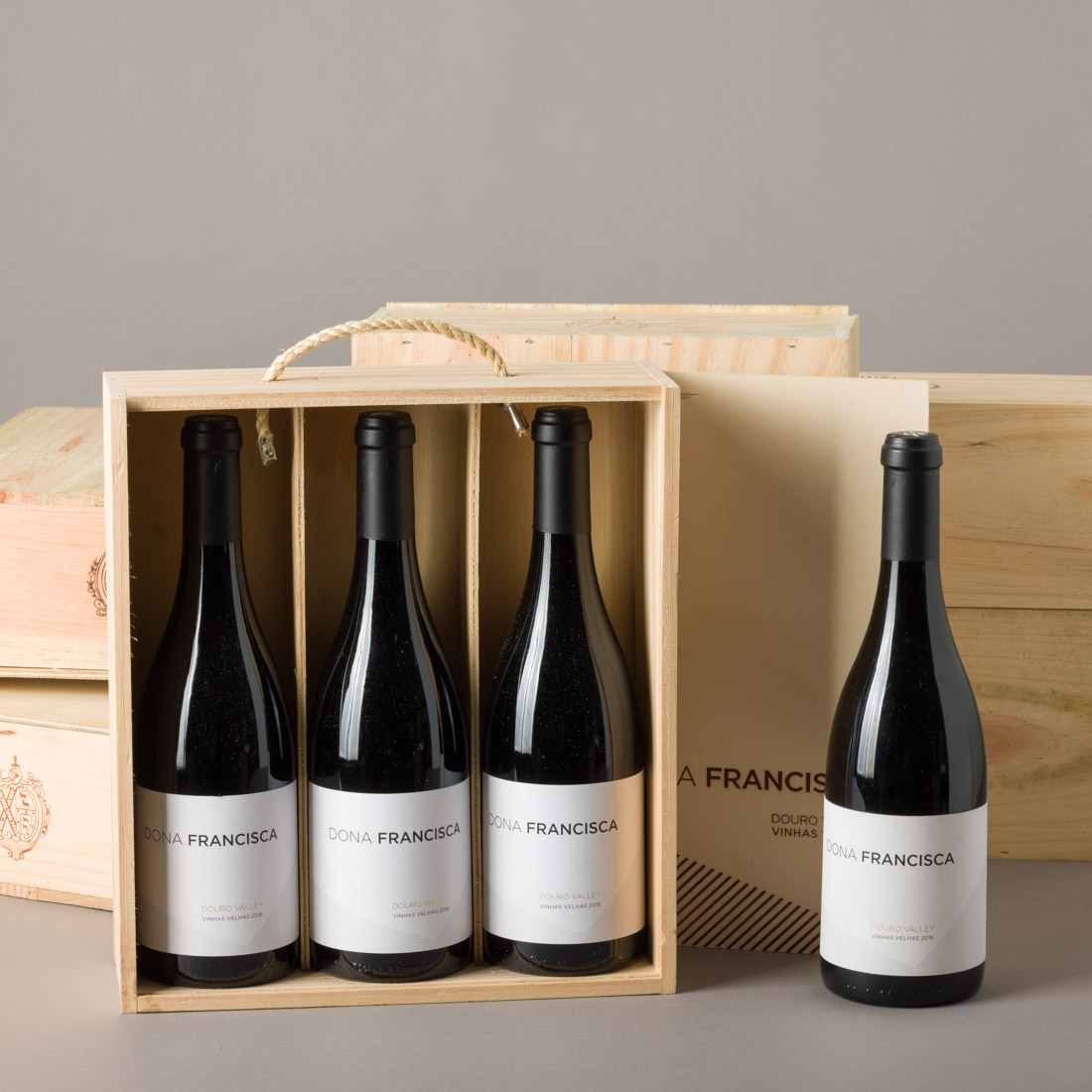 Quatro garrafas 750ml, caixa original em madeira.