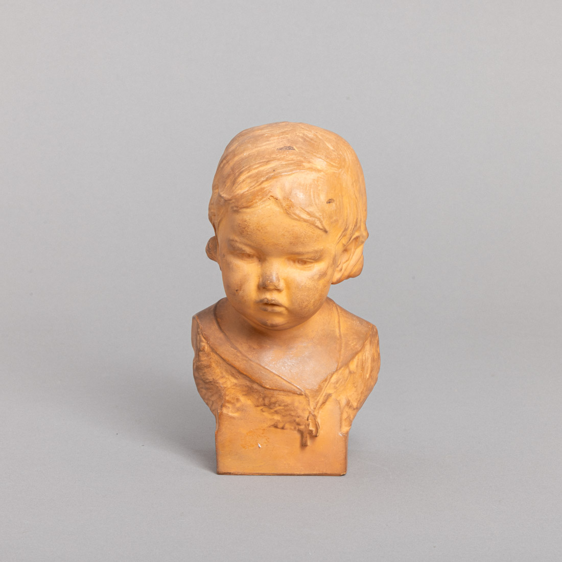Busto de menina, escultura em terracota, assinada. Sinais de uso e pequena falha no nariz.