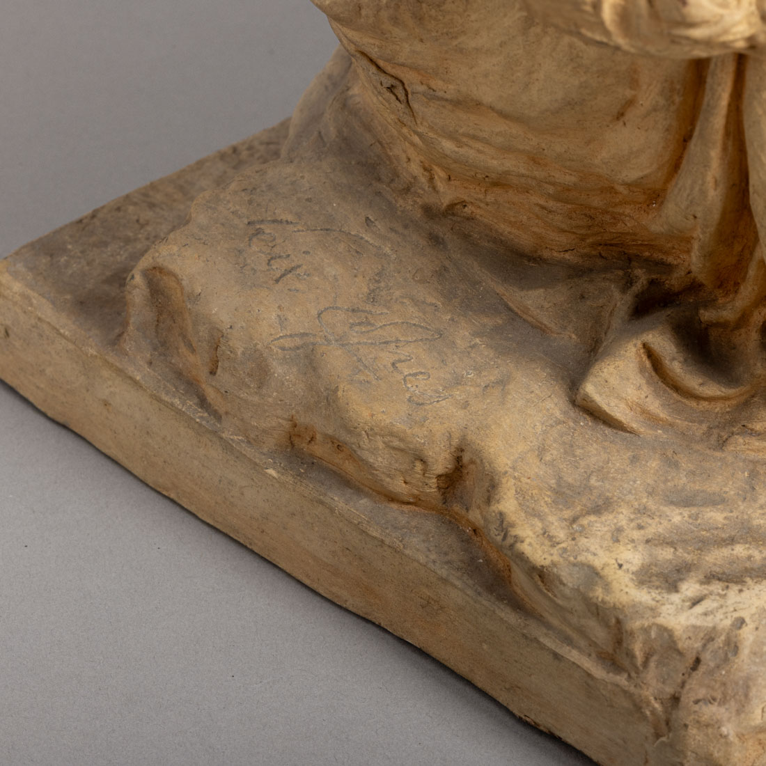 Escultura em terracota patinada, assinada com carimbo da fundição E.A. Teixeira Lopes - Gaya Portugal. Sinais de uso e pequenas falhas.
