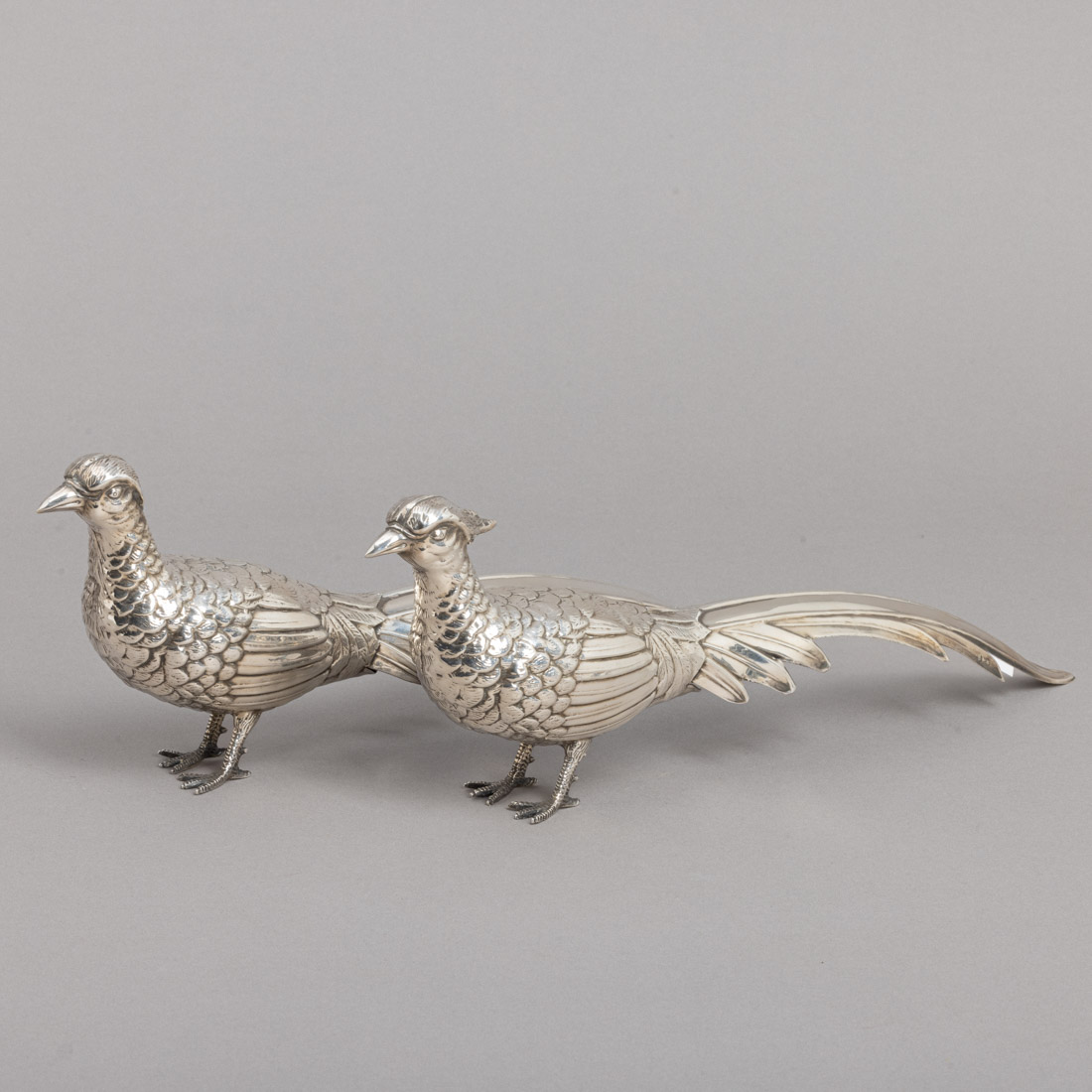 Esculturas em prata espanhola de 915 marcas de garantia de teor (pós 1934), decoração relevada. Pequenas amolgadelas e um com falha na cauda.