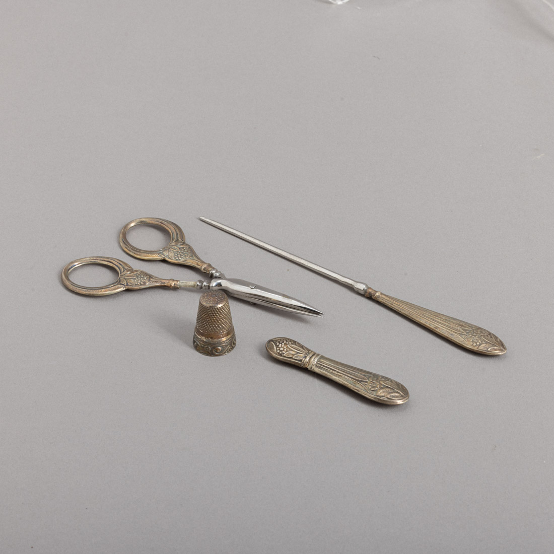 Em prata e cabos em prata portuguesa contraste águia (1938-1984) de 833, decoração relevada "flores", composto por agulheiro, dedal, tesoura e agulha de croché. Sinais de uso e tesoura com pequenos defeitos.