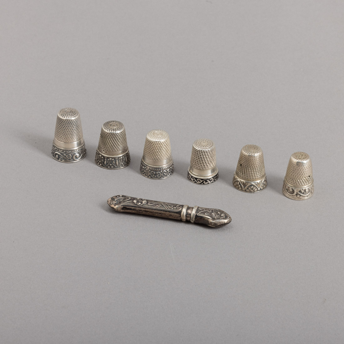 Em prata portuguesa contraste javali (1887-1937) e águia (1938-1984) de 833, decoração diversa, um sem marcas, ao abrigo do D/L. n.º 120/2017. Sinais de uso, três dedais com defeitos e agulheiro com amolgadelas.