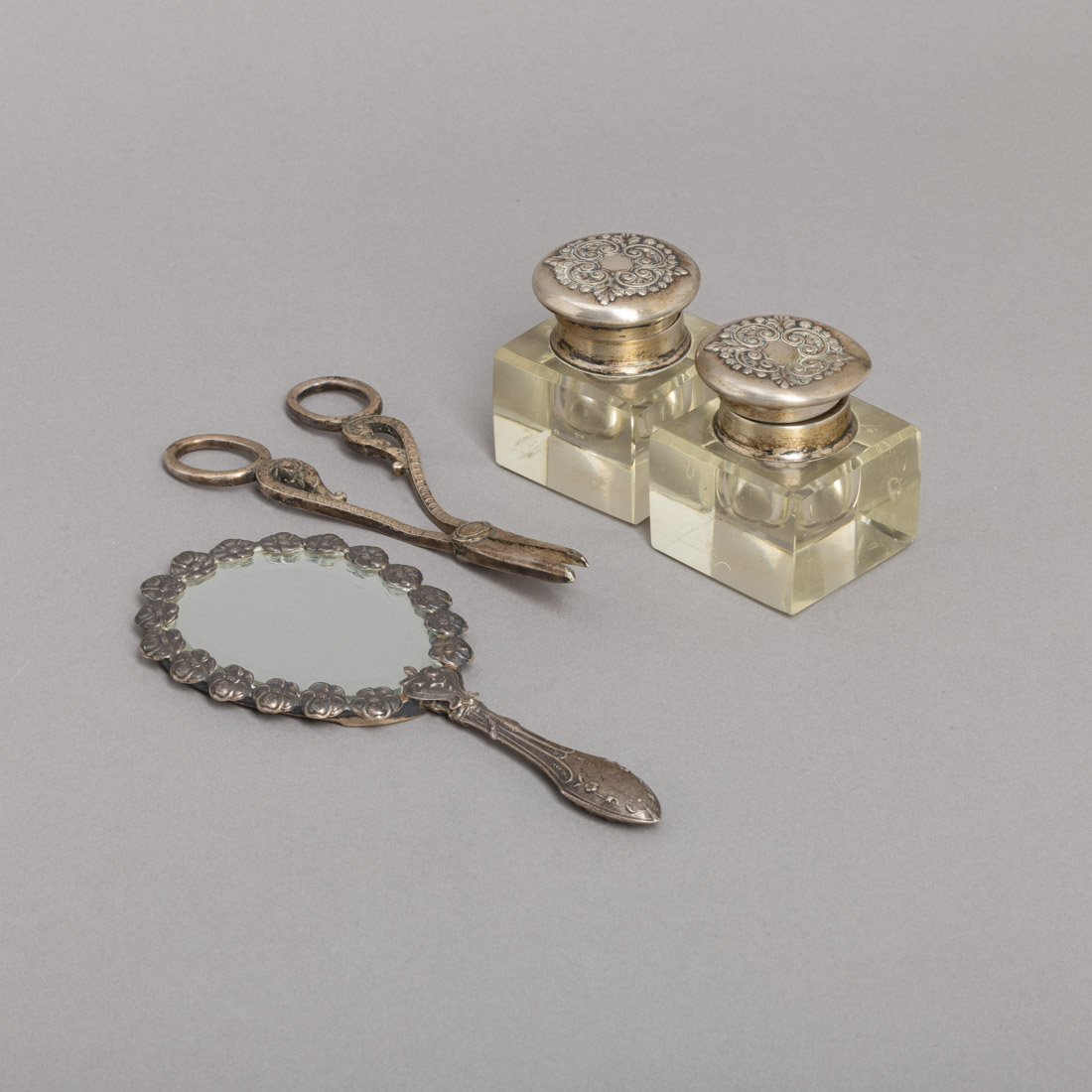 Em vidro com tampas em prata decoração relevada (amolgadelas), sem marcas ao abrigo do D/L n.º 120/2017, espelho de mão com cabo e moldura contraste águia (1938-1984) de 833, decoração "flores", acompanha tesoura de uvas em metal prateado. Sinais de usoe tinteiros com esbeiçadelas. Dim.: 6,5x5x5; 17 e 14,5 cm.