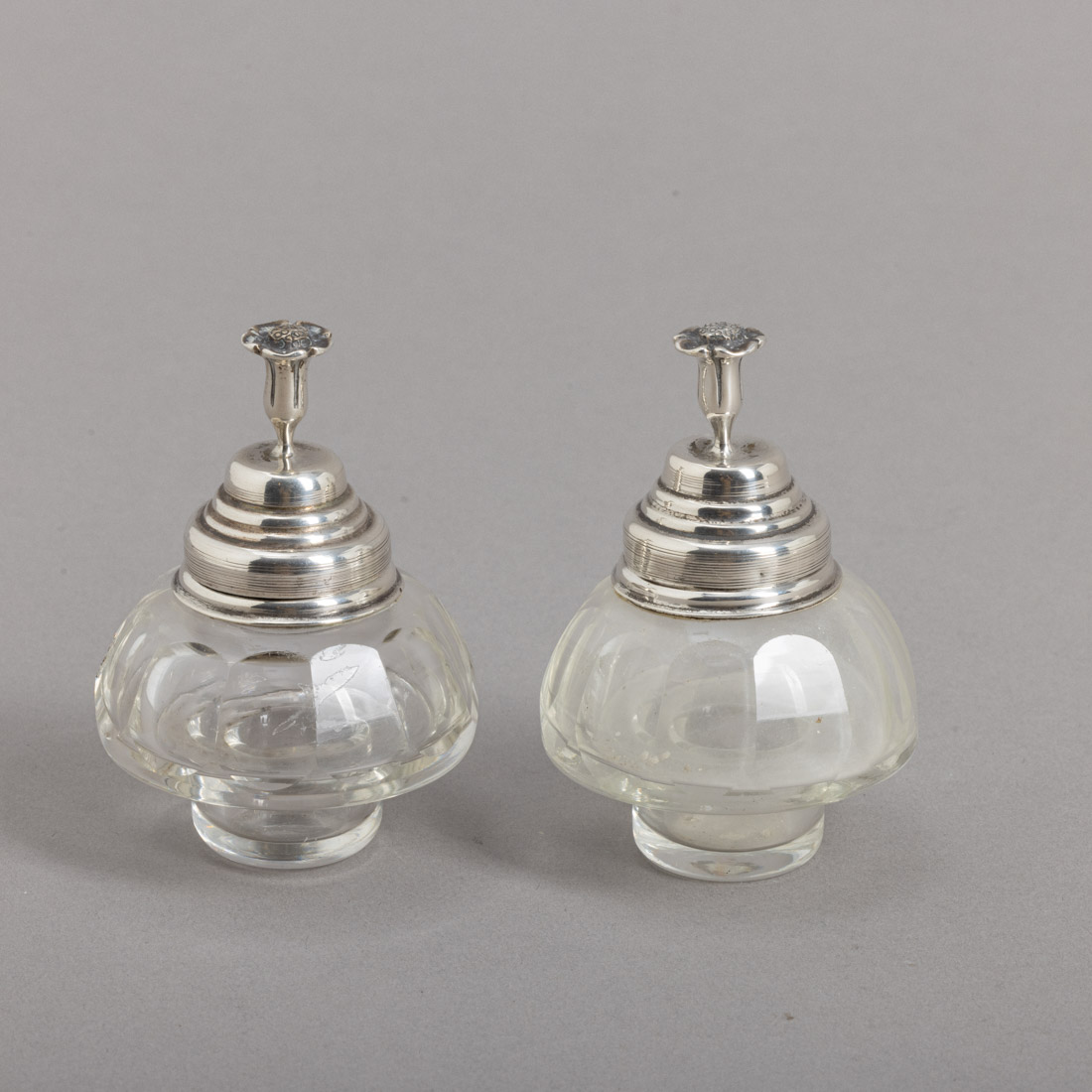 Em vidro, aro e tampas em prata, decoração relevada "flor". Sem marcas, ao abrigo do Decreto-Lei n.º 120/2017. sinais de uso e um com pequenas esbeiçadelas e ligeiras oxidações.