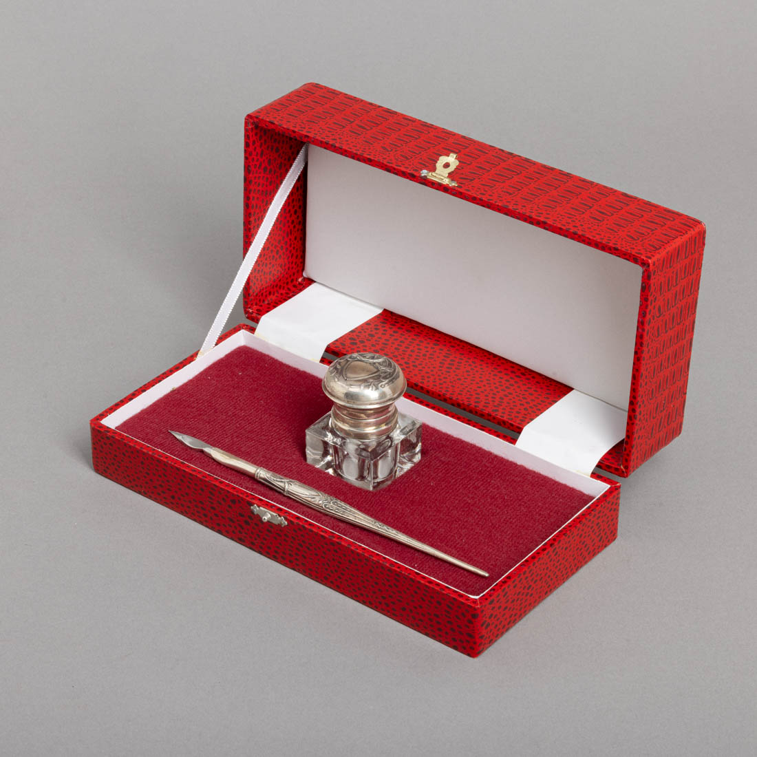 Em vidro e prata portuguesa contraste águia (pós 1985) de 835, decoração relevada. Em estojo. Sinais de uso.
