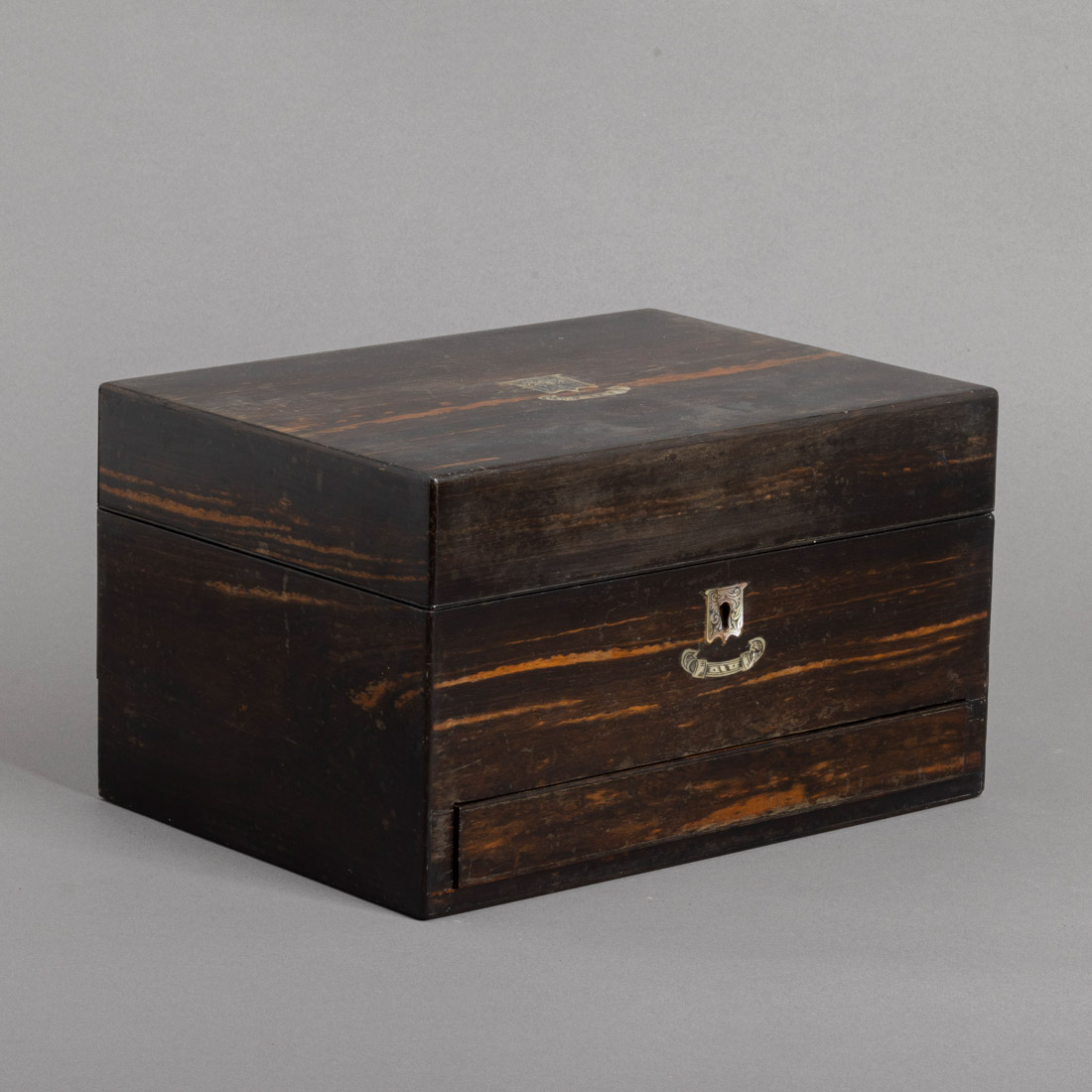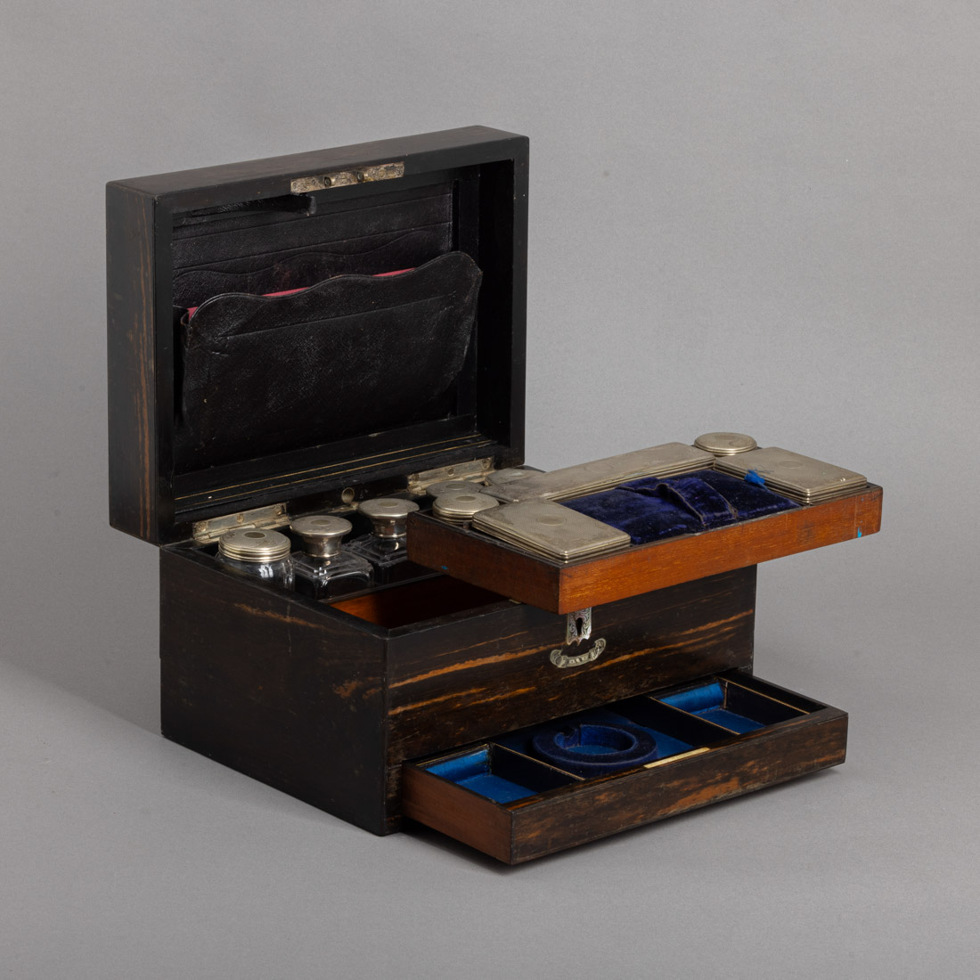 Folheada a pau santo, aplicações em madrepérola e gaveta, no interior diversos frascos e caixas em vidro com tampas em metal prateado decorado com gravados. Inglesa, Séc. XIX/XX. Pequenos defeitos, frascos com ínfimas esbeiçadelas e uma caixa com falhas.Dim.: 18x31x22,5 cm.