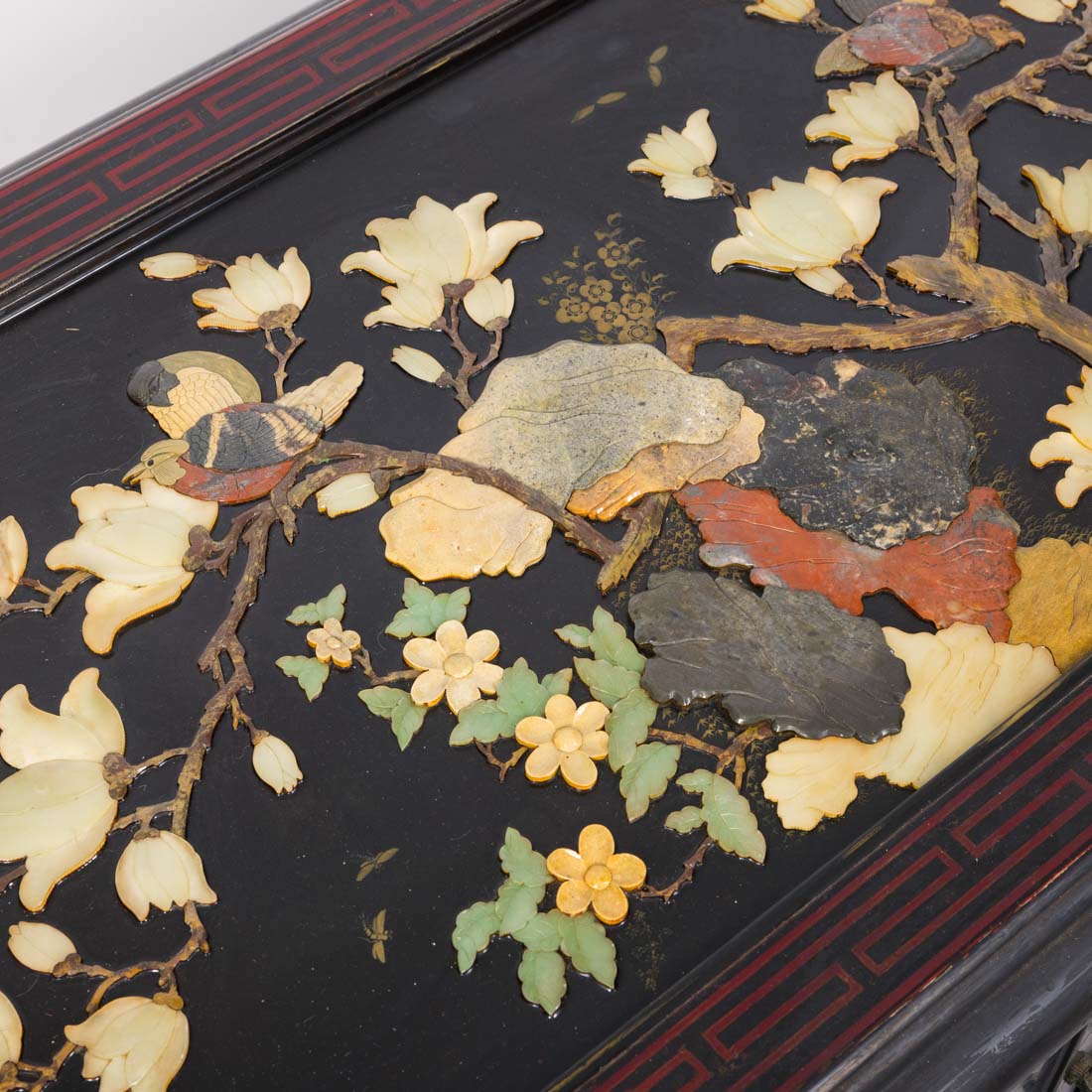 Em madeira lacada e pintada, aplicações de pedra dura "flores e pássaros", pequenas portas e gavetas. Pequenas falhas e defeitos.