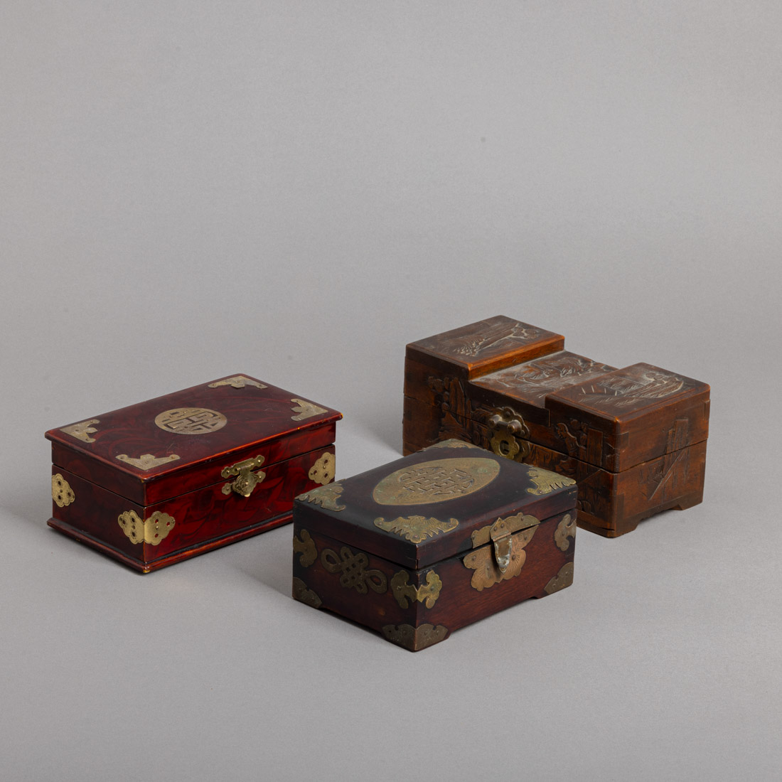 Em diferentes madeiras, uma entalhada e duas com aplicações em metal amarelo. Pequenos defeitos e uma com falhas.