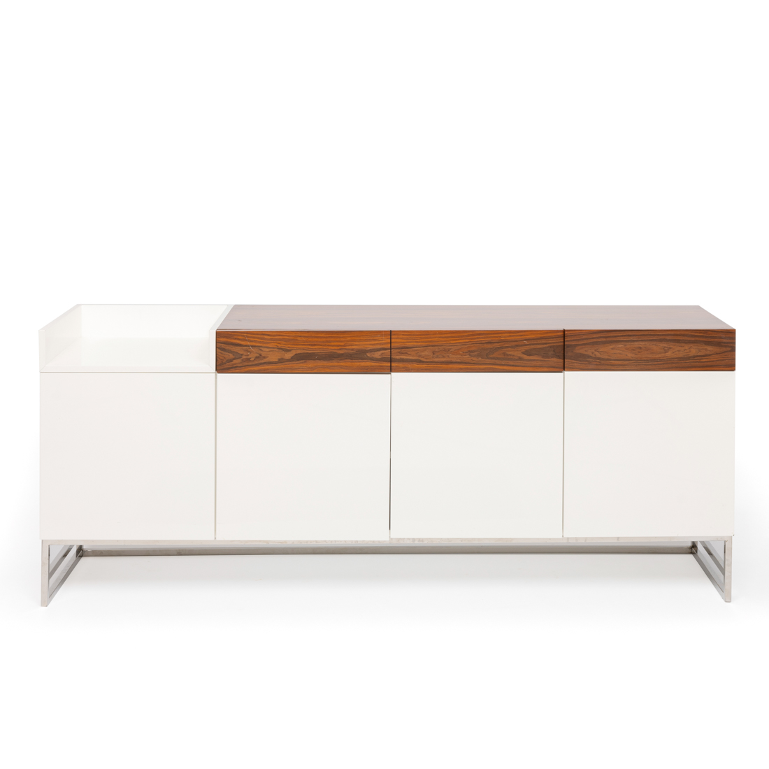 Em madeira lacada a branco e folheada a madeira exótica, pés em metal cromado, de quatro portas e duas gavetas simulando três. Pequenos defeitos.