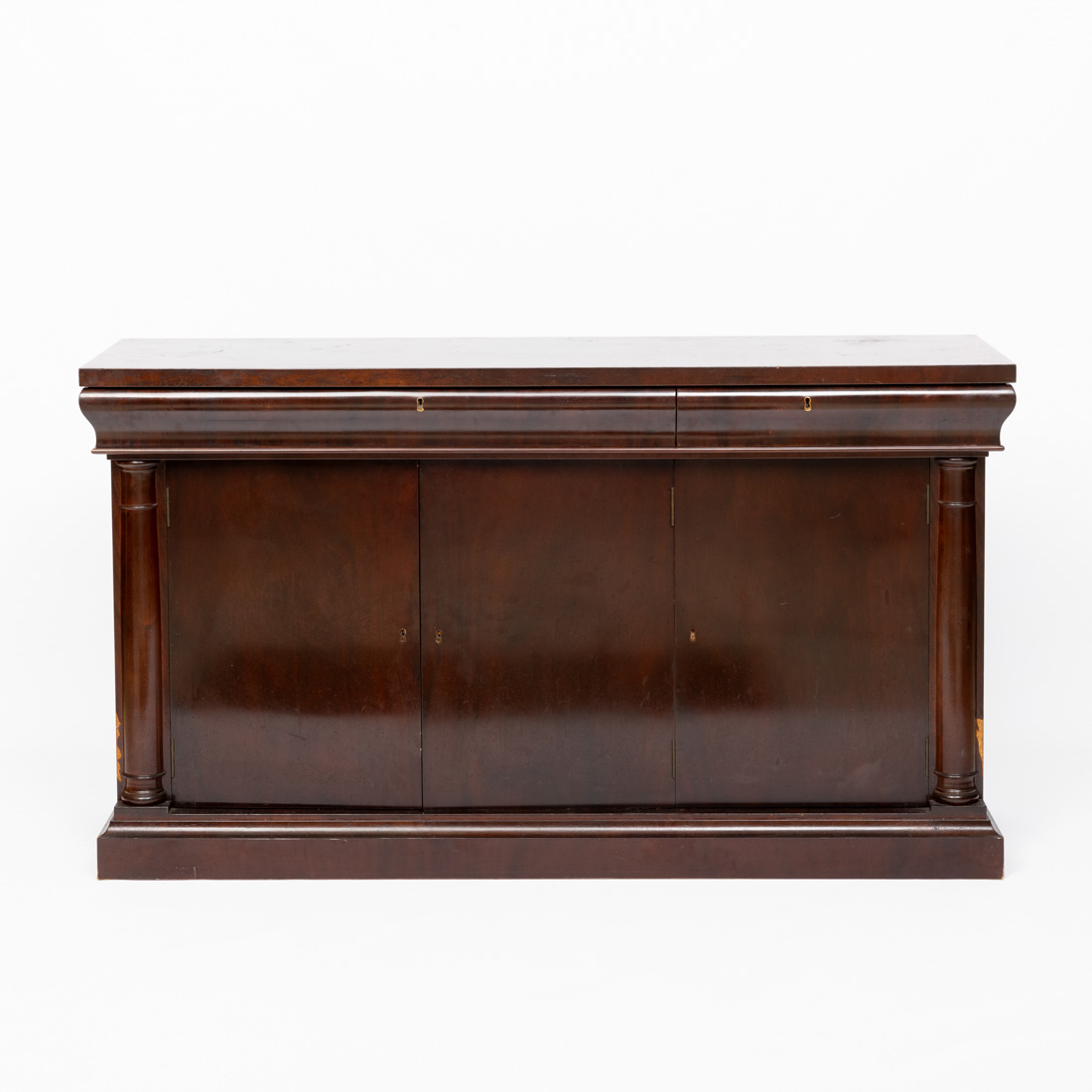 Em mogno, folheado a mogno e outras madeiras, de três portas e duas gavetas. Falhas e pequenos defeitos.