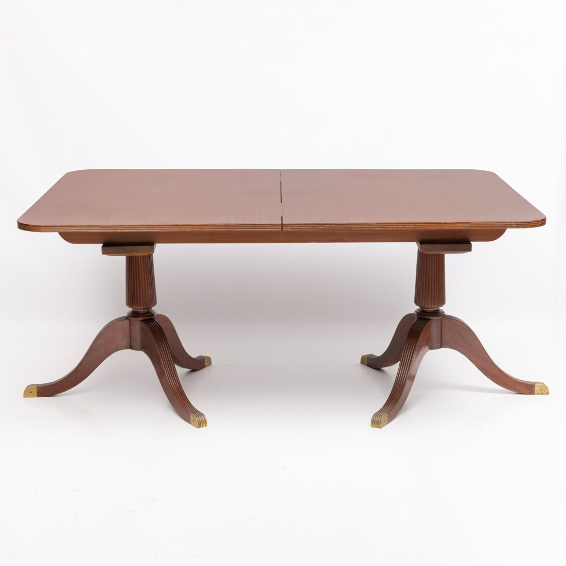 Estilo inglês, em mogno de dupla coluna torneada, pés com ponteiras em metal amarelo, com duas tábuas de extensão. Pequenas falhas e defeitos.