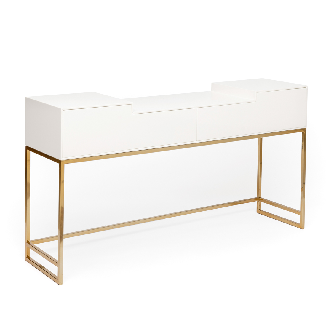 Em madeira lacada a branco, pés em metal dourado, de duas gavetas. Sinais de uso.