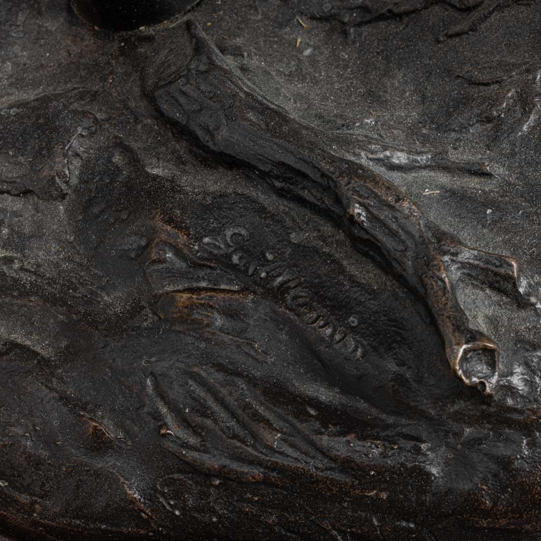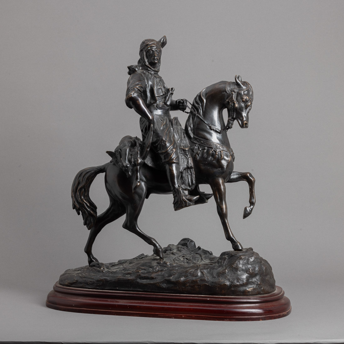 Escultura em bronze patinado, base em madeira, assinada. Sinais de uso.