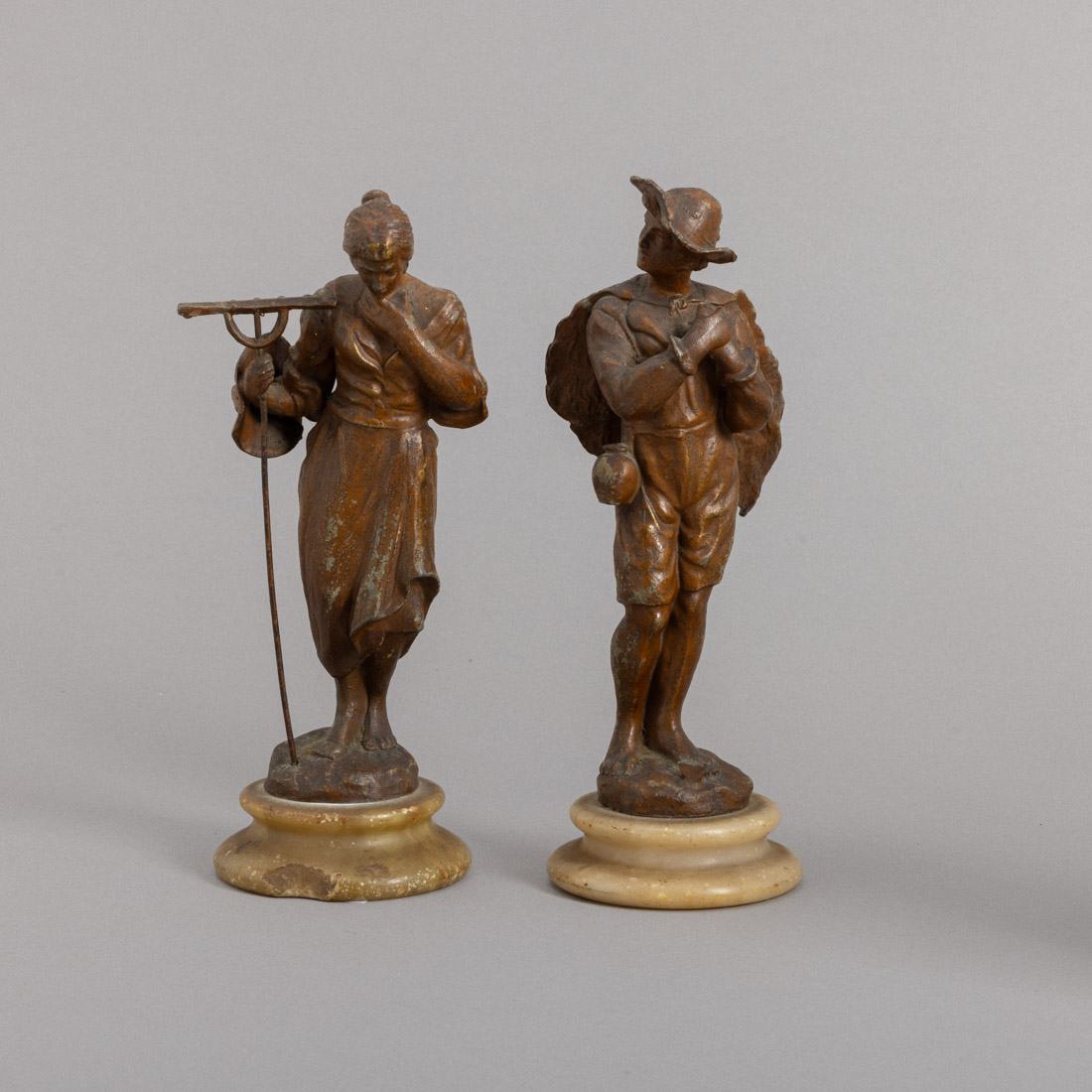 Esculturas em liga de metal patinado, bases em alabastro. Falhas e esbeiçadelas nas bases.