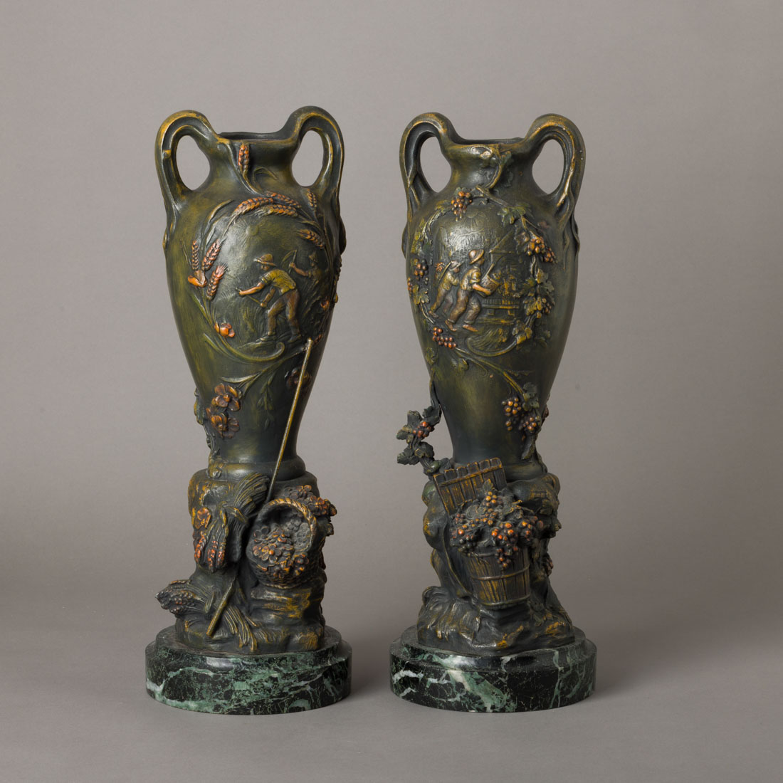 Em bronze de arte relevado, decoração policromada com motivos e cenas campestres, base em mármore, assinadas François Moreau. Sinais de uso e pequenas falhas na mármore.