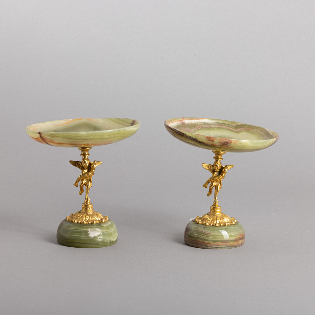 Em ónix verde, pé em metal amarelo relevado "querubim". Sinais de uso, pequenas esbeiçadelas e leve cabelo.