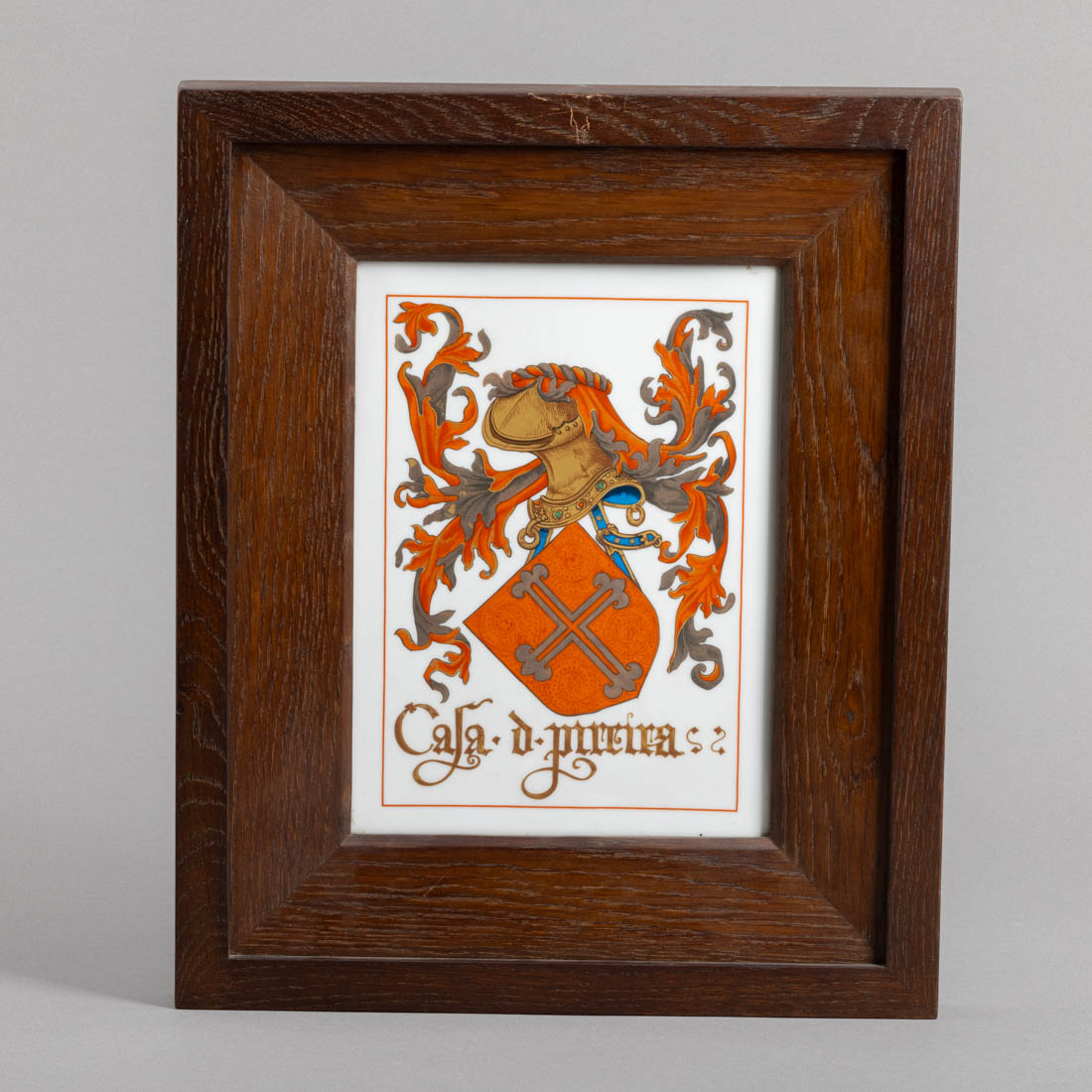 Em porcelana moldada (1980-1992), decoração policromada "Armas de D. Nuno Alvares Pereira". Edição limitada a 2500 exemplares. Emoldurada. Sinais de uso.