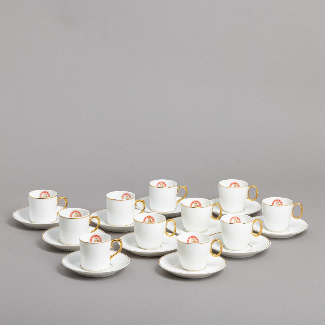 Em porcelana moldada (1947-1968/1971), decoração dourada, no interior da chávenas símbolo "O melhor café é o da Brasileira - Porto", cinco ligeiramente diferentes. Sinais de uso.