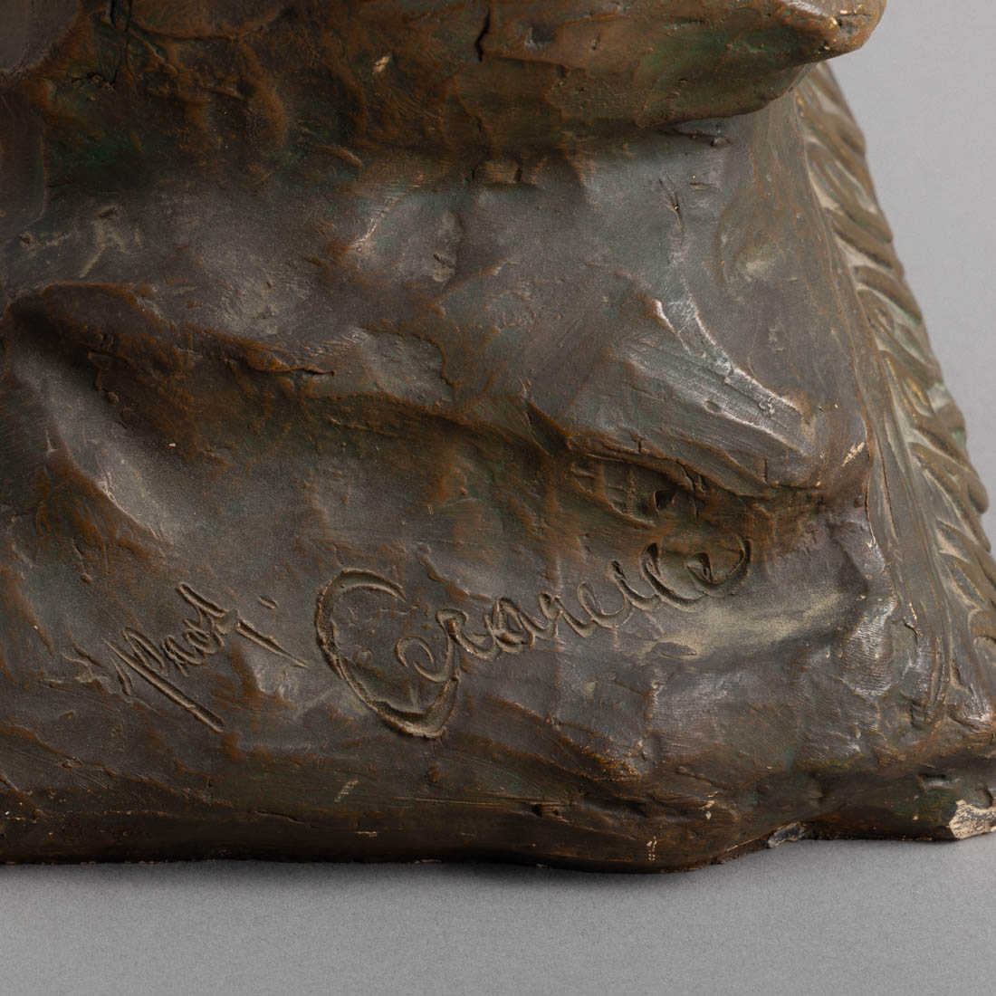 Arte Nova, escultura em terracota patinada, decoração policromada, marcada a carimbo FRITZ KOCHENDÖRFER e assinada. Sinais de uso e pequenas falhas.