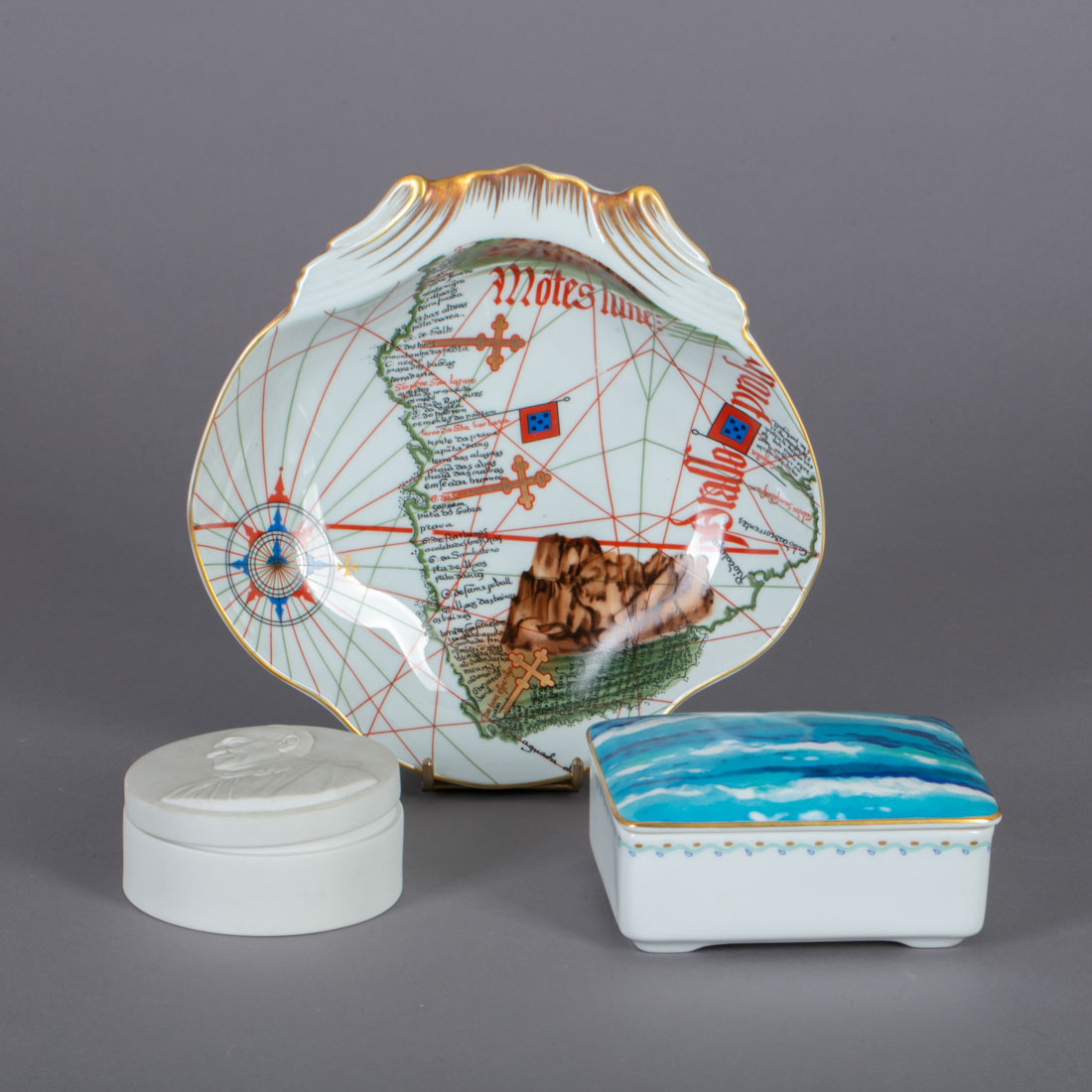 Em porcelana moldada (1980-1992/1997-2001), decoração policromada e dourada. Caixa "João Paulo II" em biscuit decoração monocroma a branco (tampa com pequena esbeiçadela e pequeno defeito). Sinais de uso.