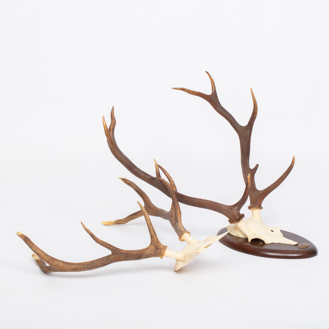 Em chifre de veado, placas ovais em madeira. Pequenos defeitos, um com falhas.