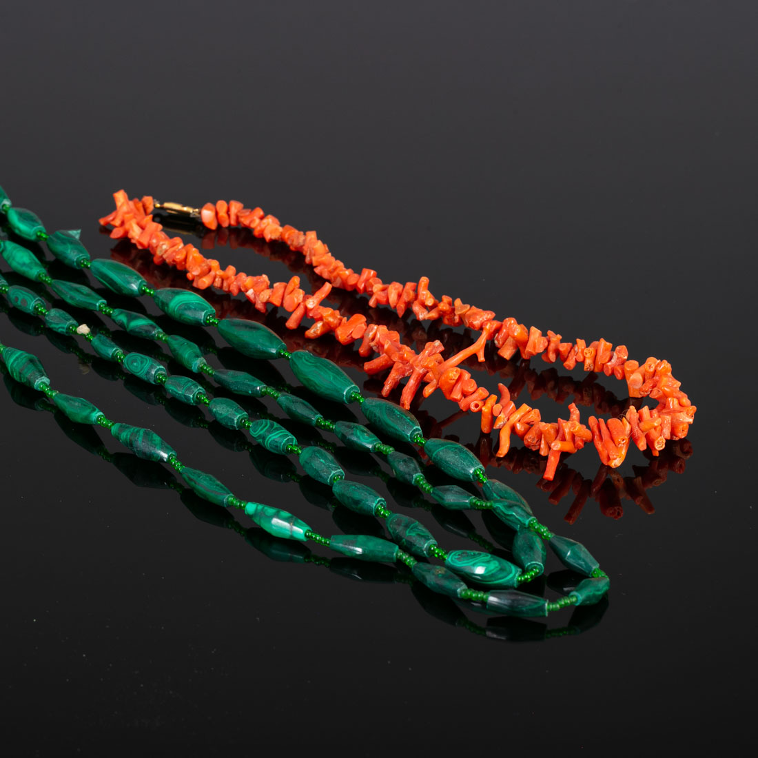 Dois em contas oblongas em malaquite, outro em ramos de coral do mediterrâneo. Sinais de uso pequenas falhas.