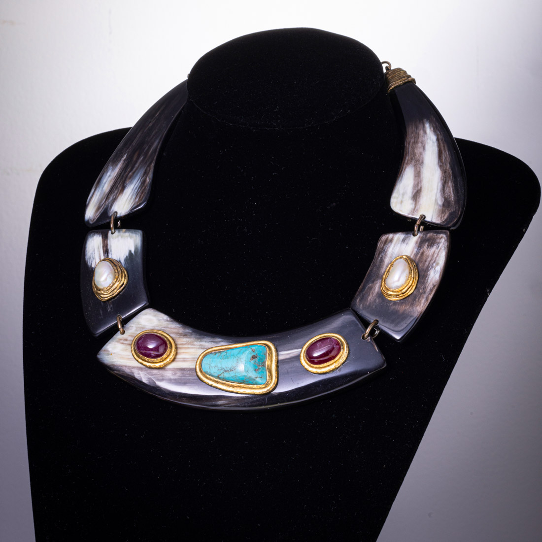 Em prata dourada de 925 e matéria córnea, cravejado com pérolas, cabochons de rubi e turquesa. Sinais de uso.