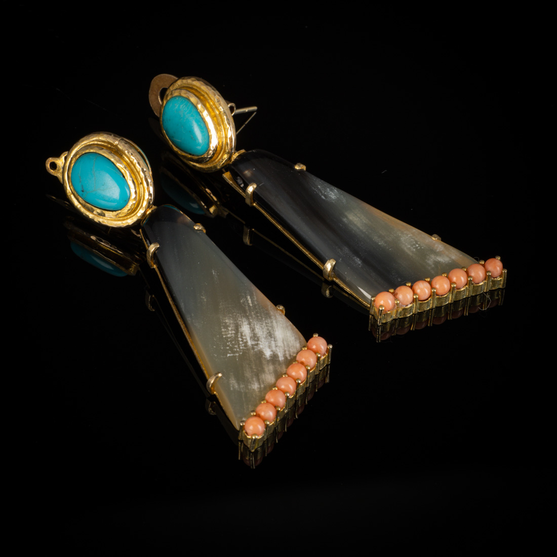 Em prata dourada de 925 cravejada com turquesa, matéria córnea e contas tom coral. Trabalho manual e desmontáveis. Sem marcas, ao abrigo do Decreto-Lei n.º 120/2017. Sinais de uso, ligeiro desgaste no dourado.