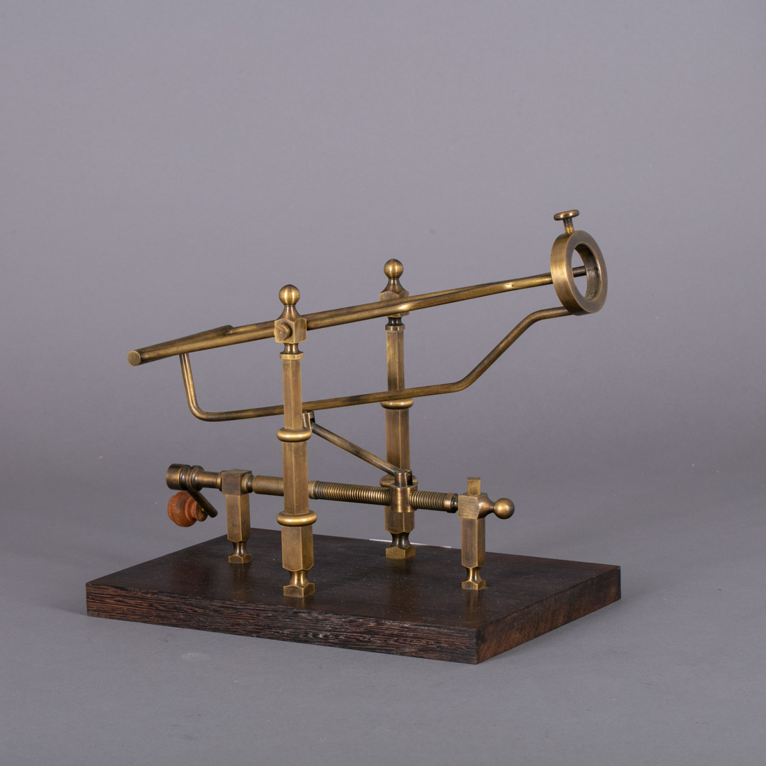 Em metal amarelo, com manipulo manual, base em madeira exótica. Sinais de uso.
